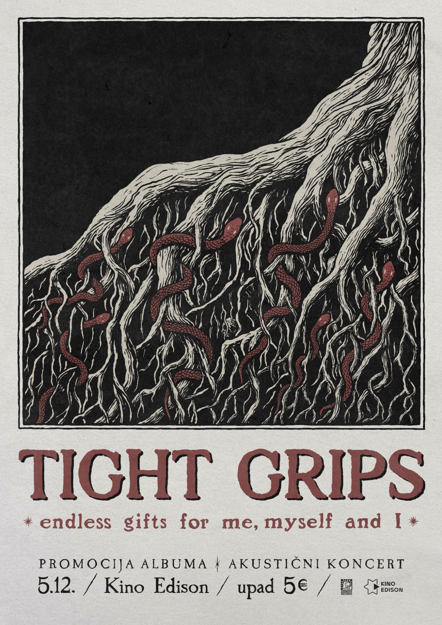 Karlovački bend Tight Grips predstavit će svoj novi album „Endless Gifts for Me, Myself and I“ u petak, 5. prosinca 2025. godine, u 20 sati u Kinu Edison. Promocija će biti popraćena posebnim akustičnim koncertom, što je nesvakidašnji format za njihov prepoznatljivo energični i žestoki glazbeni izričaj.